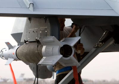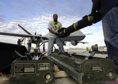 General Atomic contractors Alexander Holcomb and Darryl France off-load an AGM-114 Hellfire missile from a fully armed MQ-9 Reaper after landing on an Afghanistan runway Nov. 4, 2007. (U.S. Air Force photo/Staff Sgt. Brian Ferguson)(Released)
