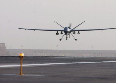 AFGHANISTAN An Air Force MQ-9 Reaper unmanned aerial attack vehicle prepares to land after a mission in support of Operation Enduring Freedom. The Reaper has the ability to carry both precision-guided bombs and missiles. (U.S. Air Force photo Staff Sgt. Brian Ferguson, Released)