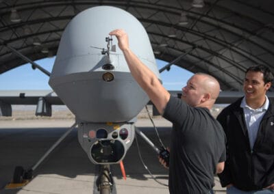 SrA Angel Torres, crew chief, 432d Aircraft Maintenance Squadron (AMXS), Creech Air Force Base, Nev. performs a pre-flight inspection on the MQ-9 Reaper as Jeremy Estoban, General Atomics Aeronautical Systems, Inc. looks on. The February 28, 2008, flight was the first ever blue-suit launch of the Reaper. These aircraft and ground control stations have been maintained by General Atomics Aeronautical Systems, Inc. (GA/ASI) contractors ever since. U.S. Air Force photo by Staff Sgt. Kenny Kennemer (released)
