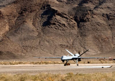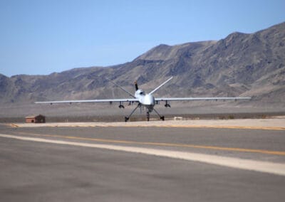 The MQ-9 Reaper taxis into Creech Air Force Base Tuesday. This marks a historic day for the MQ-9 Reaper, as it was the first operational airframe of it’s kind to land at Creech. This Reaper is the first of many to be assigned to the 42nd Attack Squadron. (U.S Air Force Photo by Senior Airman Larry E. Reid Jr.) (Released)
