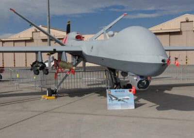 An MQ-9 Reaper, assigned to the 432nd Wing at Creech Air Force Base, Nev., awaits visitors at the Aviation Nation air show on Nellis Air Force Base, Nev., Nov. 11, 2007. Aviation Nation is the Air Force’s premiere air show and one of the largest in North America. This years show commemorated 60 years of air power and is the capstone event of the Air Force’s yearlong 60th anniversary celebration. (U.S. Air Force photo by Airman 1st Class Kasabyan D. McGarvey) (Released)