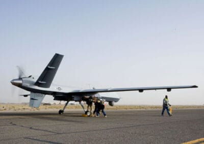 U.S. Air Force aircrews perform a preflight check on an MQ-9 Reaper unmanned aerial vehicle before it takes off for a mission in Afghanistan Sept. 30, 2007, during Operation Enduring Freedom. (U.S. Marine Corps photo/Released)