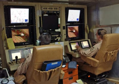 Capt. Richard Koll, left, and Airman 1st Class Mike Eulo perform function checks after launching an MQ-1 Predator unmanned aerial vehicle Aug. 7 at Balad Air Base, Iraq. Captain Koll, the pilot, and Airman Eulo, the sensor operator, will handle the Predator in a radius of approximately 25 miles around the base before handing it off to personnel stationed in the United States to continue its mission. Both are assigned to the 46th Expeditionary Reconnaissance Squadron. (U.S. Air Force/Master Sgt. Steve Horton)